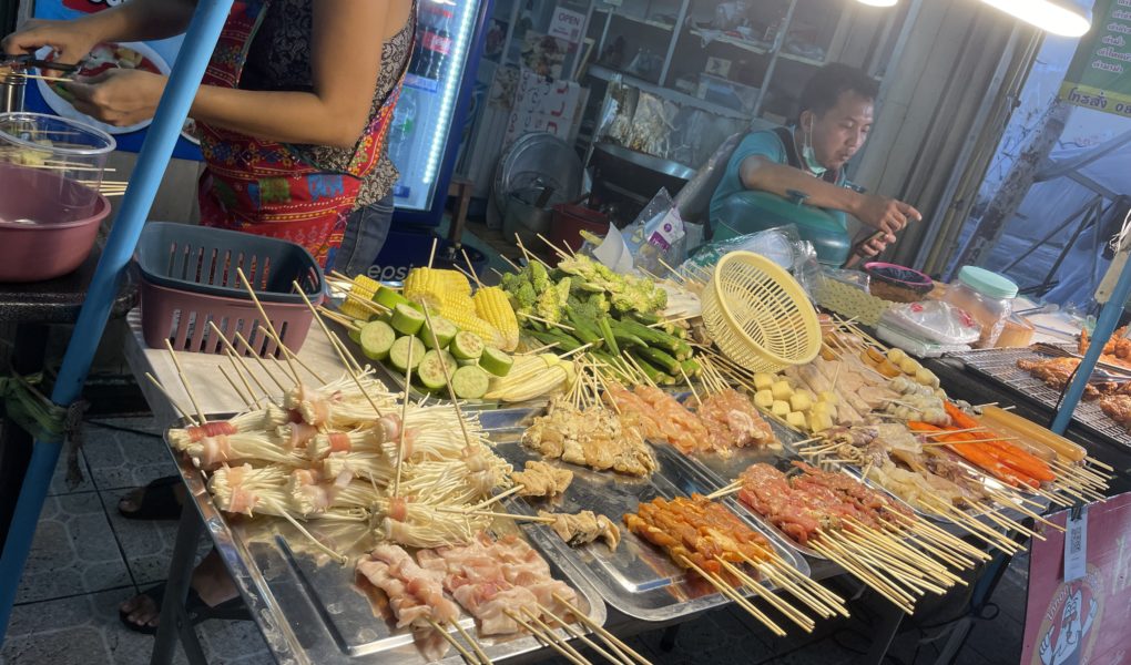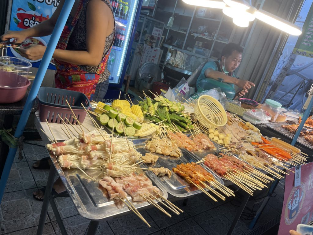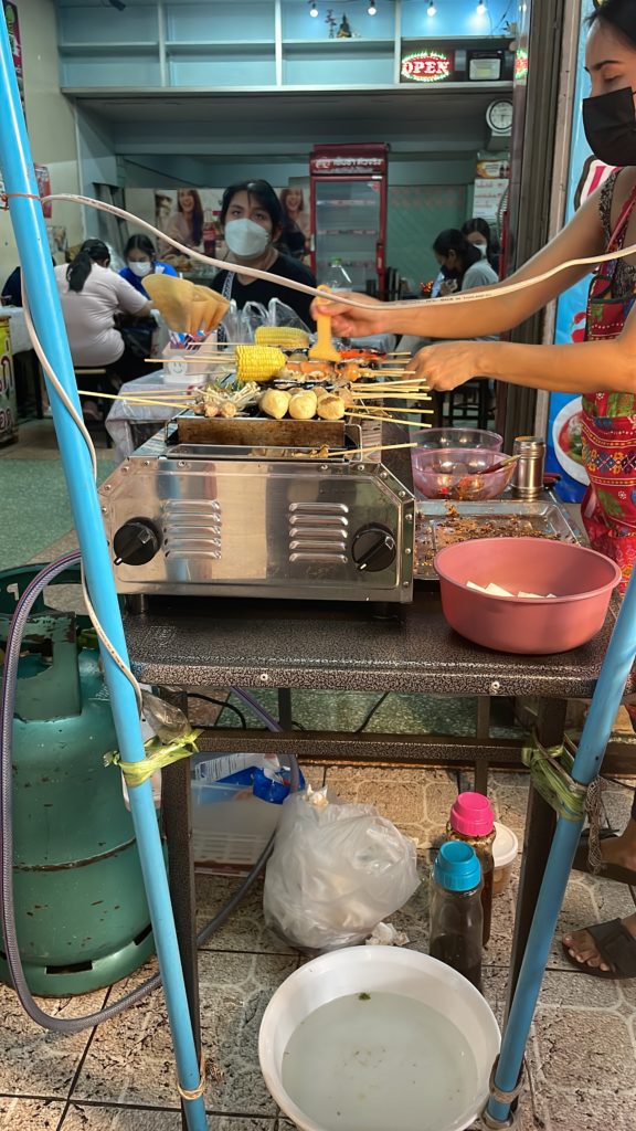 Vor kurzem habe ich nahe meinem Apartment außerdem einen Stand mit einer riesigen Auswahl an Spießen entdeckt! Es gibt alles von vegetarischen Sachen wie Pilzen, Zucchini und Mais über Lachs, Shrimps, Hähnchen und Rind. Man kann sich die rohen Spieße selbst aussuchen und sie werden dann frisch gegrillt und mariniert – wobei „little spicy“ auch hier nicht unbedingt der Wahrheit entspricht… beim ersten Mal haben meine Augen gar nicht mehr aufgehört zu tränen. Da muss ich noch ein bisschen ausprobieren, um ein aushaltbares Schärfe-Level für mich zu finden 😀 Aber es schmeckt trotzdem unglaublich lecker!
