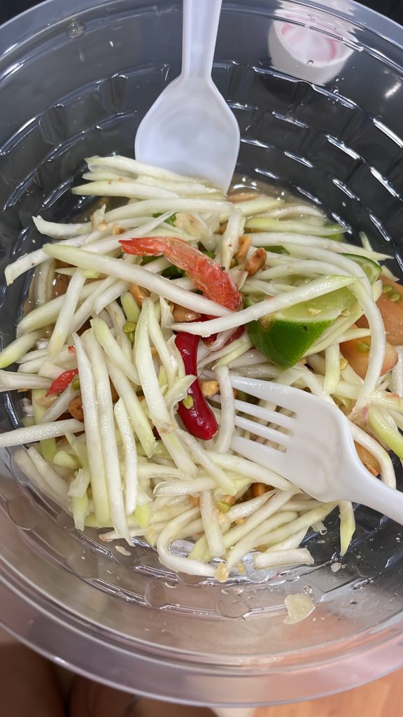 Papaya Salat (inzwischen habe ich auch das thailändische Wort gelernt: Som Tum) ist eins meiner absoluten Lieblingsgerichte hier! Für die Zubereitung werden rohe Papaya-Streifen (daher schmeckt es auch völlig anders als die süße Papaya, die wir in Deutschland kennen), Tomaten, Karotten, Erdnüsse, Bohnen, Knoblauch, Shrimps und – typisch thailändisch – ganz viel Chili in einem Tonmörser vermischt. Mit dem Schärfegrad habe ich mich schon einige Male vertan, weil auch „little spicy“ locker zwei von drei Chilischoten in einem deutschen Restaurant entsprechen würde. Trotzdem ist es suuuuper lecker!