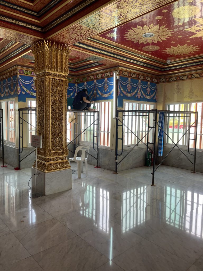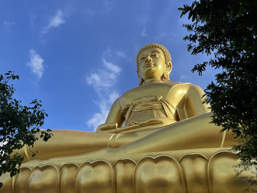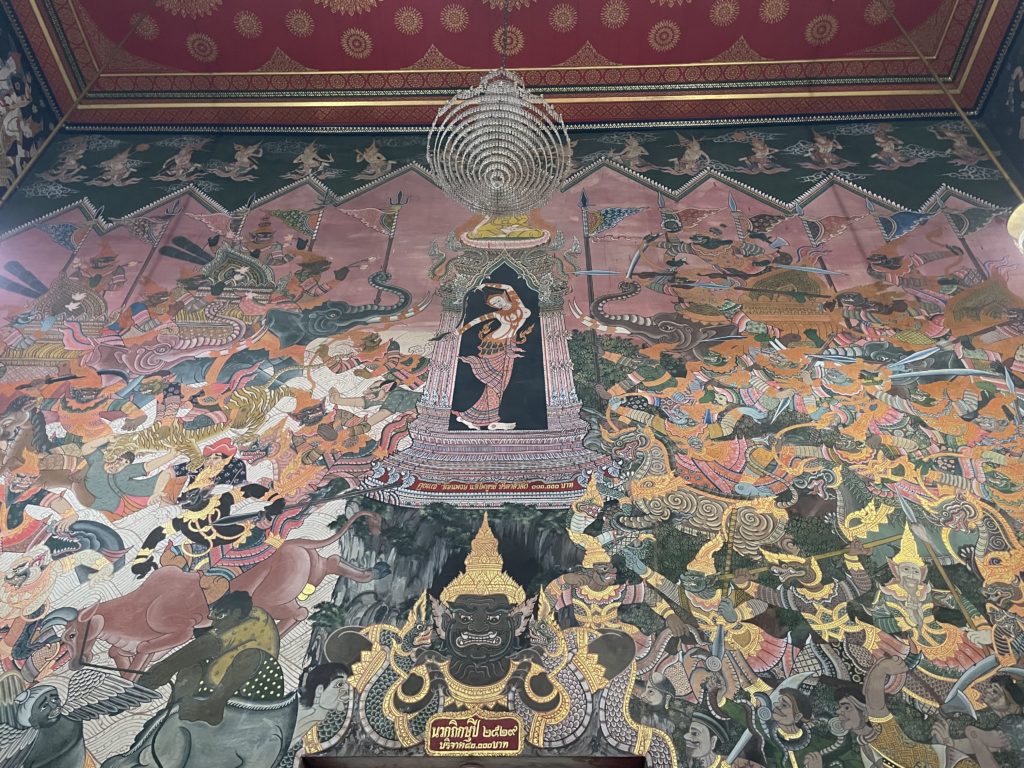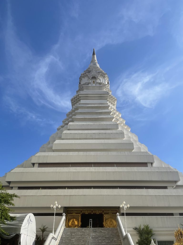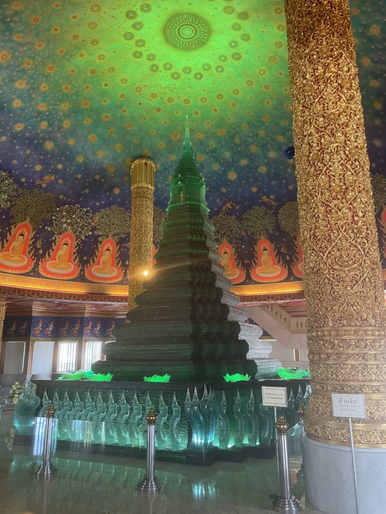 An dem Tag, an dem ich mein neues Apartment gefunden habe (ich kann gar nicht glauben, dass das schon einen Monat her ist!), habe ich auch einen meiner absoluten Lieblingsorte in Bangkok entdeckt. Auf dem Weg zur Wohnungsbesichtigung konnte ich aus dem Fenster der Bahn einen riesigen goldenen Buddha zwischen den Hochhäusern sehen. Nach der Besichtigung bin ich dann spontan dort vorbeigegangen und war seitdem fast jede Woche dort. Der Buddha ist Teil einer größeren Klosteranlage mit Tempeln, Bibliothek, Garten und einer Mediationsschule. Der gesamte Bereich strahlt eine vollkommene Ruhe und Frieden aus und meistens sind nicht allzu viele Menschen dort. Ein paar Touristen gibt es zwar, aber ansonsten hauptsächlich Thais, Mönche und Schulkinder. Ich war schon zu unterschiedlichen Zeiten dort und jedes Mal ist das Erlebnis etwas anders. Einmal habe ich zugehört, wie die Mönche gesungen haben, dann einmal mit ein paar Katzen im Garten gesessen oder einmal den Ausblick über Bangkok von dem Stupa aus genossen. Der Stupa ist der hohe weiße Turm hinter dem goldenen Buddha und beherbergt eine Art Museum sowie eine Aussichtsplattform. In der obersten begehbaren Etage befindet sich ein weiterer kleiner Stupa aus smaragdfarbenem Glas. Die Dachbemalung darüber erinnert mich immer ein bisschen ans Universum oder den Sonnenaufgang. Als ich das erste Mal dort war, war ich einfach nur überwältigt von der Schönheit dieses Ortes.
