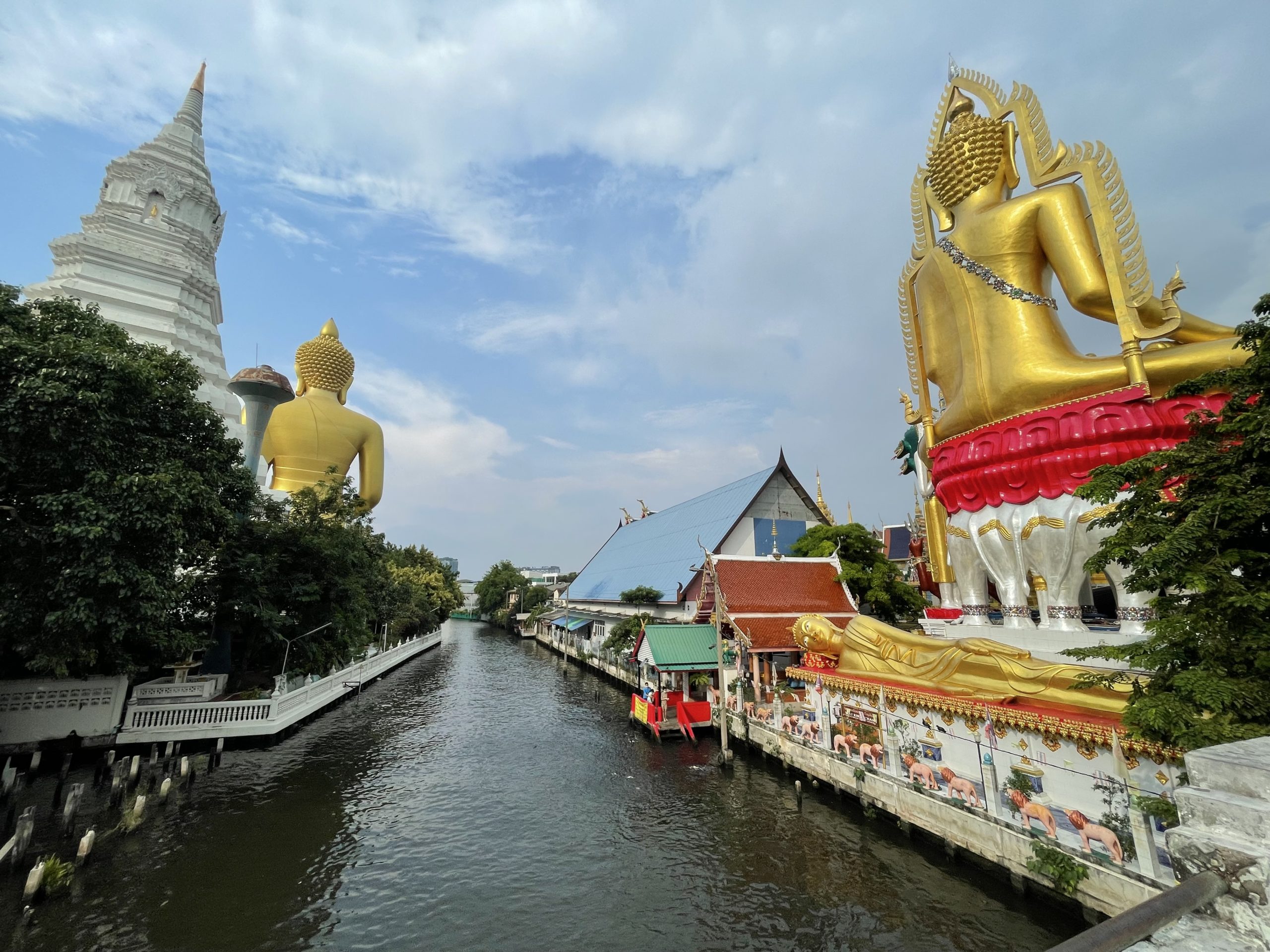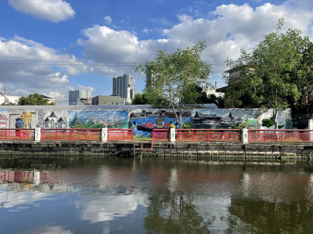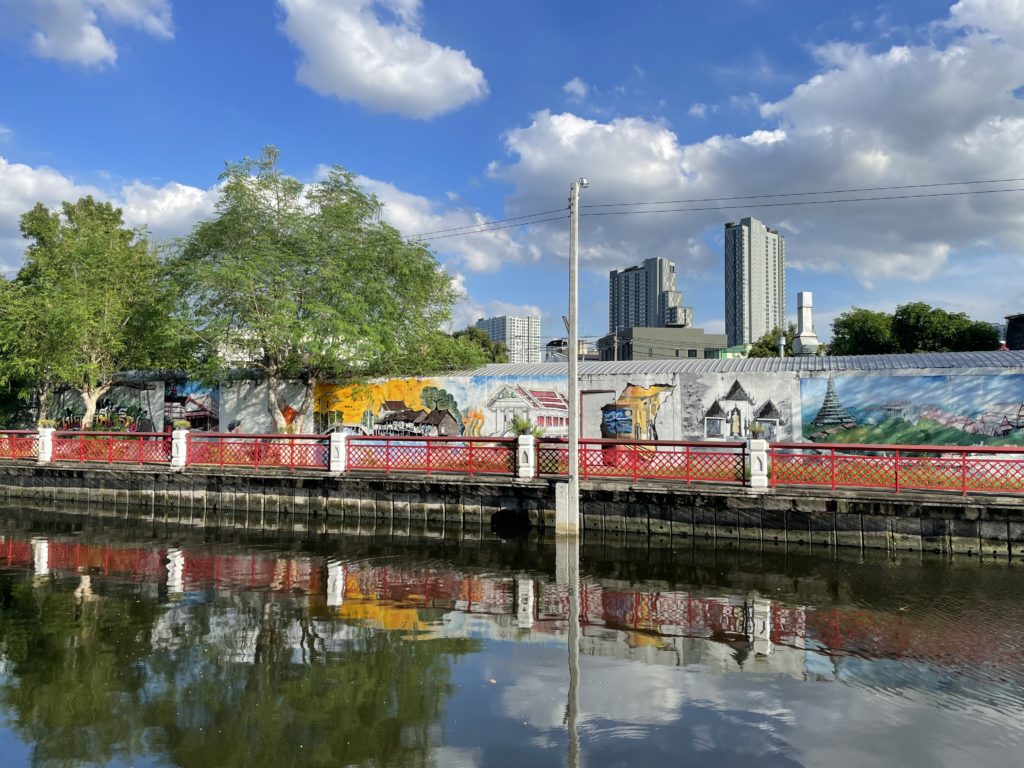 Inzwischen habe ich auch einen Weg von meiner Wohnung zum Tempel gefunden, der nicht mal bei Google Maps angezeigt wird. Er führt direkt am Kanal entlang und ist an sich schon ein Erlebnis. Bisher sind mir ausschließlich Einheimische dort begegnet, die jedes Mal unglaublich freundlich sind. Obwohl ich zugeben muss, dass es ein bisschen gewöhnungsbedürftig ist, dort immer wie ein bunter Hund aufzufallen – besonders die Schulkinder sind sehr begeistert und grüßen mich immer ganz aufgeregt auf Englisch. Trotzdem spaziere ich am liebsten dort entlang, weil es so viel zu sehen gibt und es eine ganz andere Seite vom sonst so lauten Bangkok ist. Sobald ich neben meinem Wohngebäude in den Weg einbiege, verändert sich die Umgebung um mich herum. Plötzlich ist da nur noch das Plätschern des Kanals zu meiner Rechten und Pflanzen und kleine Häuser zu meiner Linken. Manchmal kann ich ein bisschen in die Häuser hineinschauen und so einen kleinen Einblick in das Leben der Einheimischen erhaschen. Einmal hat sogar jemand geangelt und genau in dem Moment als ich vorbeigekommen bin, den zappelnden Fisch aus dem Wasser gezogen. Bangkok hat zwar unglaublich viele Sehenswürdigkeiten und Aktivitäten zu bieten, aber mir gefallen solche Orte am allerbesten, fernab vom Trubel und trotzdem mittendrin im Leben. Bestimmt werde ich noch ganz oft dorthin gehen solange ich in Bangkok bin!